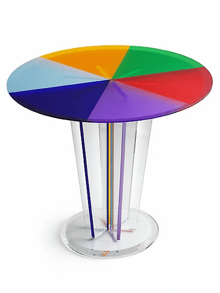 Le design moderne et épuré de cette table est mis en valeur par l’utilisation de PMMA Altuglas ® transparent. Le plateau, aux couleurs vibrantes, présente un dégradé subtil de nuances qui évolue à la lumière. Créant ainsi une atmosphère chaleureuse et dynamique. La surface est soigneusement polie pour garantir une finition impeccable et une brillance éclatante.